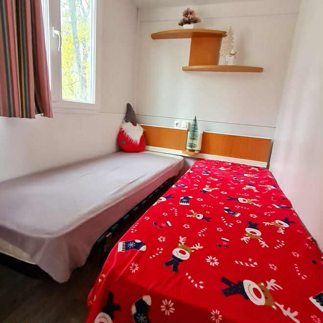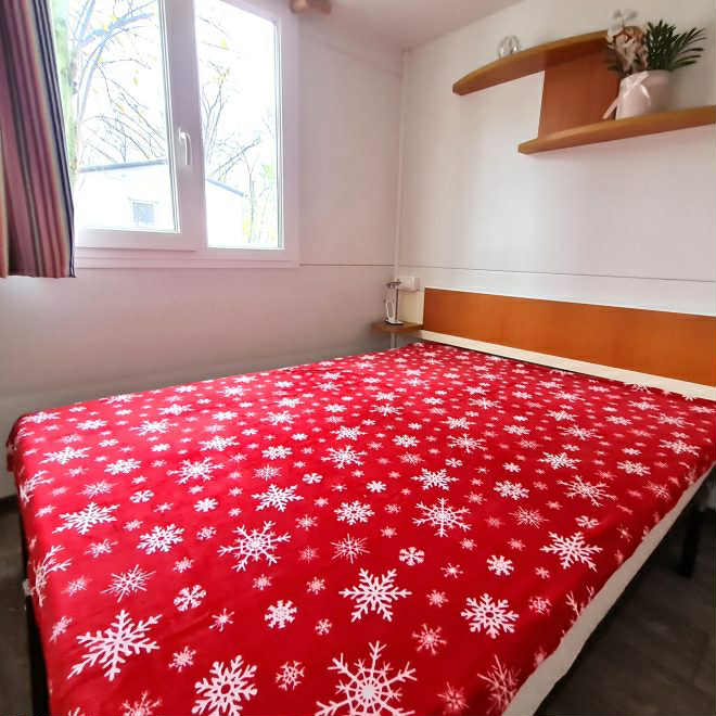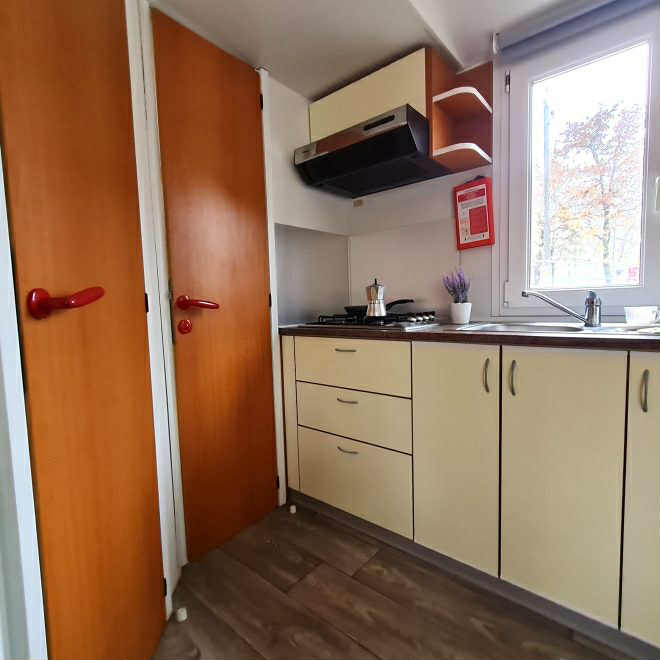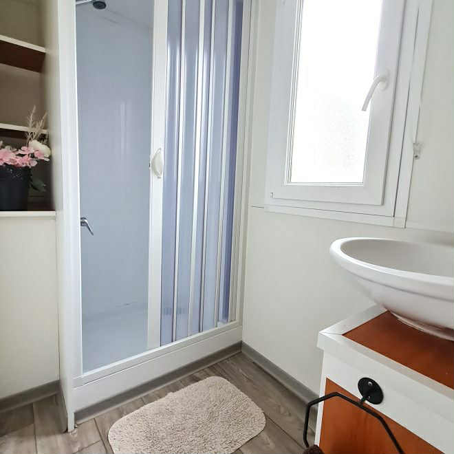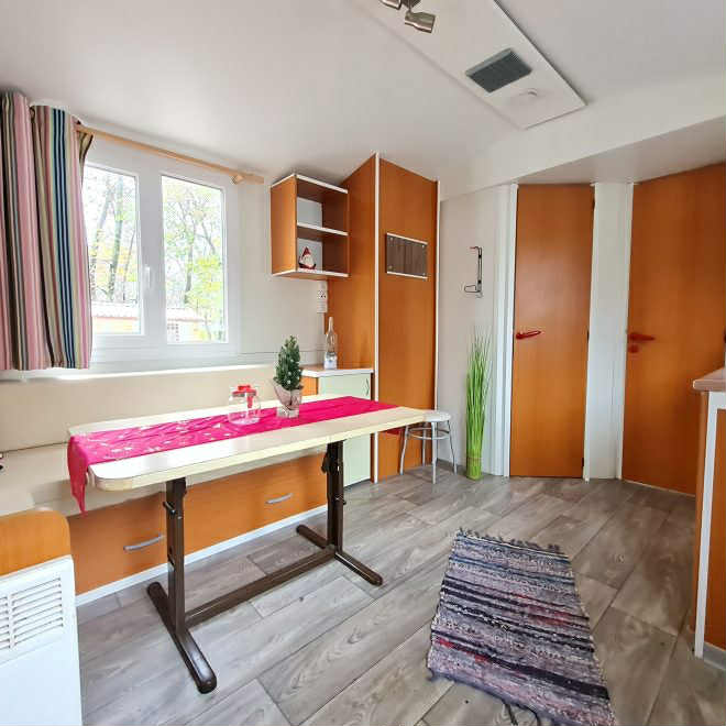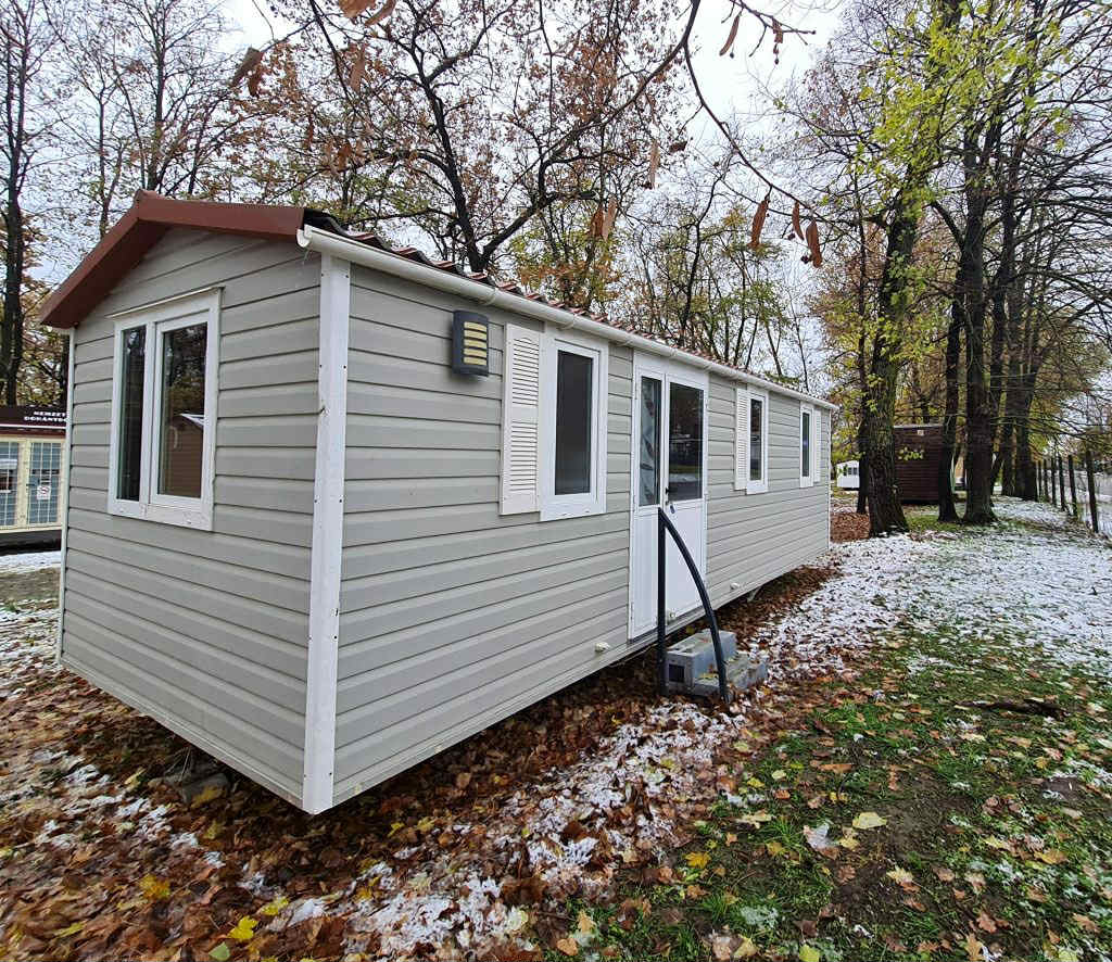 Eladó 8 x 3 méteres, 4 évszakos, amerikai nappali kialakítású, magasított mennyezetű, két hálóteres (egy franciaágyas és egy külön ágyas hálószoba), egy fürdőszobás, klímával felszerelt, használt mobilház!