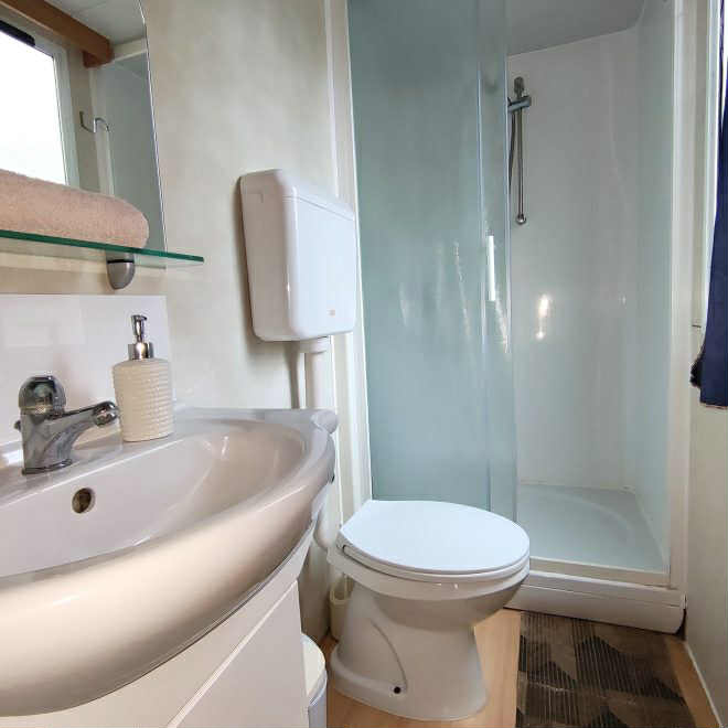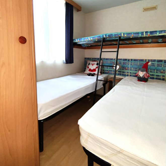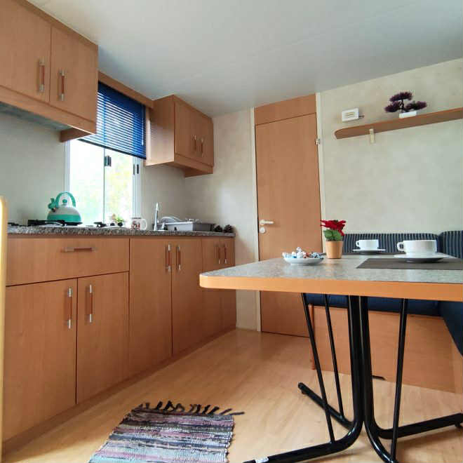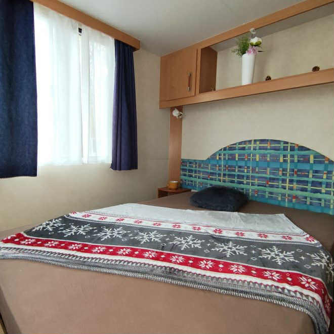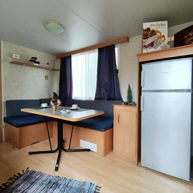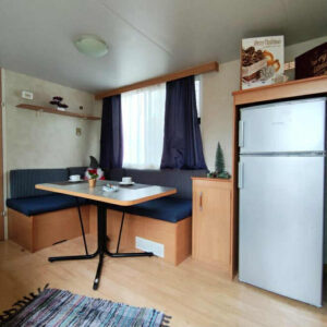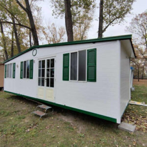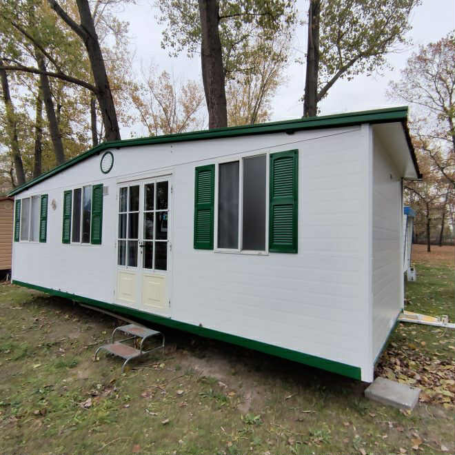 Eladó 8 x 3 méteres, amerikai nappali kialakítású, magasított mennyezetű, két hálóteres (egy franciaágyas és egy külön ágyas hálószoba), egy fürdőszobás, klímával felszerelt használt mobilház!